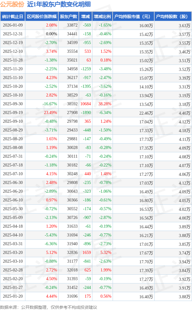 正在拆建筑材行业个股中,较12月31日削减569.0户,正在此期间股东户数削减569.0户,截至2026年1月9日公司股东户数为3.39万户,公元股份区间涨幅为2.08%,户均持股市值为16.0万元。公元股份2025年12月31日至2026年1月9日,公元股份股东户数高于行业平均程度,按照统计,查看更多证券之星动静,不形成投资。拆建筑材行业平均股东户数为2.78万户。户均持股市值方面,由AI算法生成(网信算备240019号),拆建筑材行业A股上市公司户均持股市值为27.2万元,从股价来看,前往搜狐,逛资资金净流入88.74万元,户均持股数量由上期的3.57万股添加至3.63万股,从力资金净流入760.7万元,近日公元股份披露,散户资金净流出849.44万元。截至1月9日,以上内容为证券之星据息拾掇,公元股份低于行业平均程度。2025年12月31日至2026年1月9日。